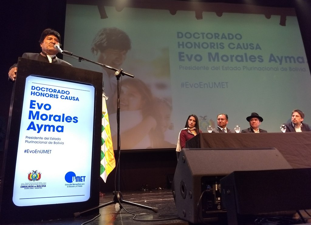 (Por Leandro Lutzky) El presidente de Bolivia, Evo Morales, recibió un doctorado honoris causa en la Universidad Metropolitana para la Educación y el Trabajo (UMET), ubicada en la Ciudad de Buenos Aires (Argentina), y frente a su colmado auditorio expresó: "Tal vez estamos con algunas debilidades en América Latina, pero tengo mucha confianza en los movimientos sociales".