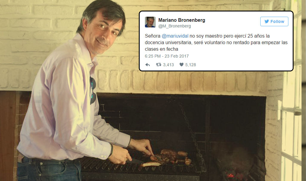Ayer a las 18:25h un tweet de Mariano Bronenberg dio origen a una campaña de “autoconvocados” que se ofrecieron como “voluntarios no rentados” para comenzar las clases en fecha y evitar el paro de los docentes bonaerenses anunciado para el 6 y 7 de marzo que ya se ha hecho extensivo a todo el país.