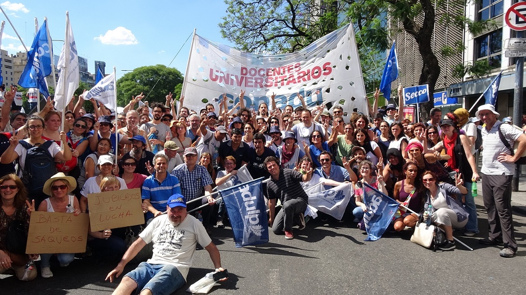 "Una importante columna de la Federación Nacional de Docentes Universitarios (CONADU) participó ayer de la movilización al Congreso, con el conjunto de las centrales de trabajadores y los movimientos sociales, para manifestar el rechazo total al proyecto de reforma previsional del gobierno de Cambiemos.