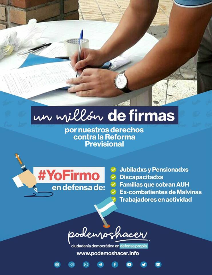 Porque estamos convencidos de que la reforma previsional aprobada por el Congreso de la Nación en diciembre pasado cercena los haberes de los actuales y los futuros jubilados, pensionados y beneficiarios de las asignaciones sociales -perjudicando a algunos de los sectores más desprotegidos de nuestra sociedad-, convocamos a nuestra militancia a redoblar los esfuerzos y a continuar interpelando a toda la ciudadanía para que apoye con su firma el pedido de derogación de la Ley Nº 27.426.