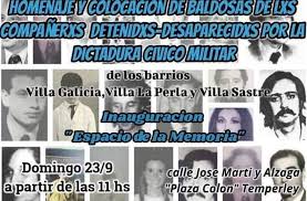 El próximo domingo 23 de septiembre se realizará un homenaje a 31 compañeros detenidos-desaparecidos de los barrios Villa Galicia, Villa La Perla y Villa Sastre. Será a las 11 horas en la Plaza Colón de Temperley, entre las calles José Martí y Álzaga, Temperley Este.