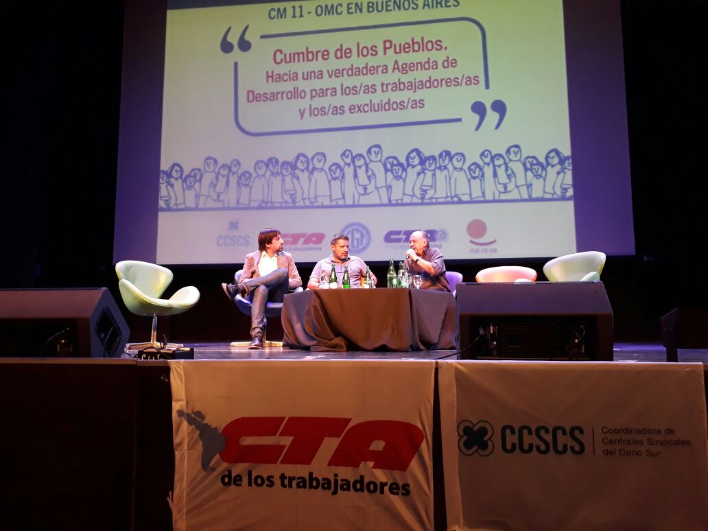 “Lo que hay es una disputa mundial de liderazgo a nivel financiero y económico. Macri quiere mostrar a los grandes capitales financieros que puede flexibilizar el mercado del trabajo”, destacó el dirigente metalúrgico Francisco “Barba” Gutiérrez, dando un cierre a la Cumbre de los Pueblos que se desarrolló al mismo tiempo que la de la OMC. Junto a Baradel y el griego Giorgius Altinzis, de la Confederación Sindical Internacional (CSI), Gutiérrez hizo un breve cierre de la jornada que tuvo modificaciones por la participación de algunos de los disertantes en el Congreso, como el secretario general de la CTA de los Trabajadores, Hugo Yasky.
