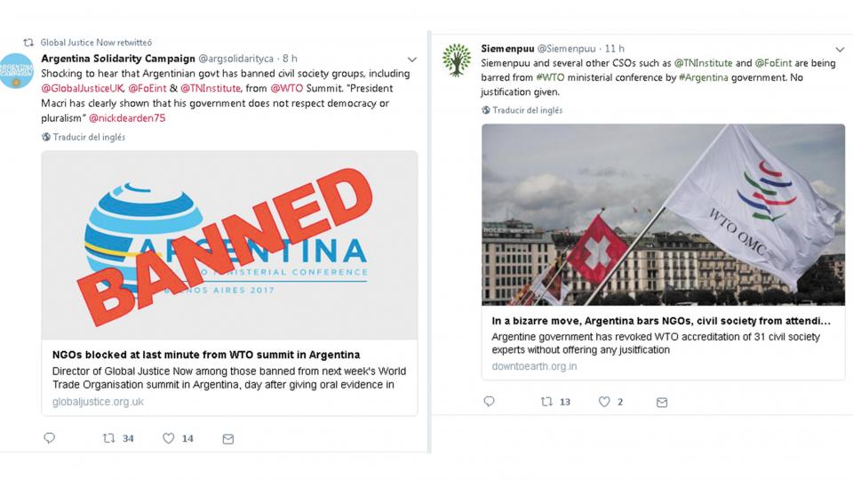 Entre las organizaciones rechazadas figuran 11.11.11 (Bélgica), Siemenpuu (Finlandia), Derechos Digitales (Chile), UNI Global Union (Suiza), Transnational Institute (Holanda) y People over profit (Filipinas). El listado incluyó a tres argentinas: Instituto del Mundo del Trabajo, Fundación Grupo Efecto Positivo y la Sociedad de Economía Crítica. "No pasó desapercibido que sobre el total de 20 organizaciones que fueron prohibidas solo dos provienen de corporaciones por lo que un número abrumador de representantes del mundo corporativo tendrán permitido ingresar", sostiene el texto. Los representantes de la sociedad civil que pretenden participar del evento advirtieron que es "irónico" que el hecho ocurra en simultáneo con la transferencia de la presidencia del G-20 de Alemania a la Argentina. "La exclusión de los delegados registrados ante la OMC es un precedente grave y preocupante, no sólo para la propia OMC y para el G20 bajo la presidencia argentina, sino para otras reuniones internacionales de este tipo".