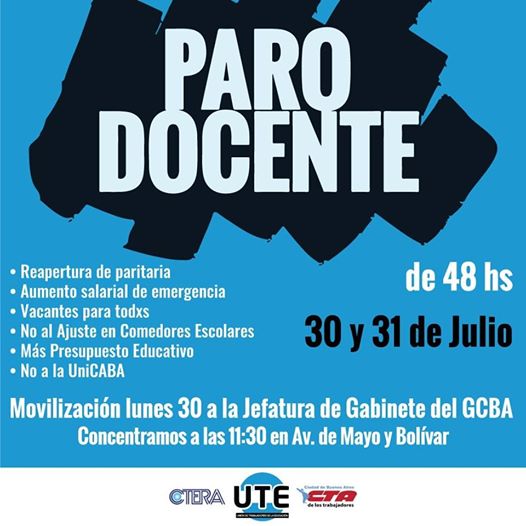 Los docentes porteños anunciaron un paro por 48 horas para reclamar la reapertura de las paritarias, negociación que cerró unilateralmente el gobierno de la Ciudad de Buenos Aire. Los maestros reclamaron ser convocados por el jefe de Gobierno Horacio Rodríguez Larreta para “solucionar el desfasaje salarial que en el primer semestre hizo perder el 8 por ciento del salario”. Los docentes de escuelas privadas también se unieron a la medida.