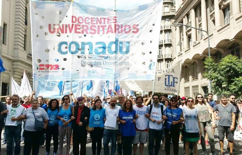 “El techo del 15% está cada día más lejos de la realidad, con los tarifazos, la disparada del dólar a 23 pesos y el aumento de las tasas de interés que impulsó el gobierno, es inadmisible que se empecinen en sostener una pauta salarial que va a ser ampliamente sobrepasada por la inflación. Para colmo el gobierno dilapidó 5.500 millones de dólares en una semana, lo que constituye una masa de recursos superior a todo el presupuesto universitario anual. Entonces, recursos hay, por eso redoblamos las medidas de lucha para que el gobierno revea su posición en materia salarial y presupuestaria” señaló Carlos De Feo, Secretario General de CONADU.