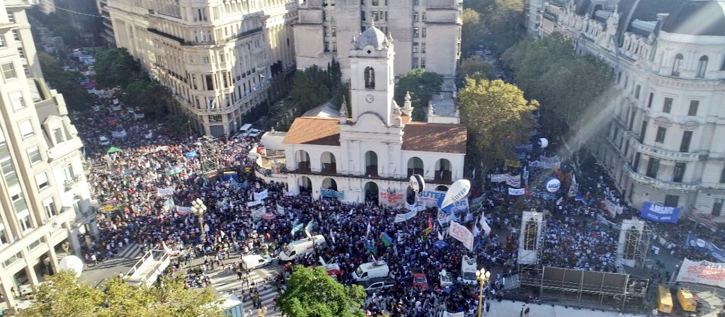 Una vez más miles de docentes se congregaron en Plaza de Mayo, una plaza vallada como nunca se vivió desde el regreso de la democracia en Argentina, de espaldas a la Pirámide, pero de frente a la Catedral porque, como señaló desde el palco el dirigente de la Unión de Trabajadores de la Educación (UTE), Eduardo López “No se puede tapar el sol con las manos. Pensaban que no íbamos a venir por las rejas que rodean la Casa Rosada… Pues bien, le hacemos honor al Cabildo de Buenos Aires, donde decimos Patria sí, colonia no.”