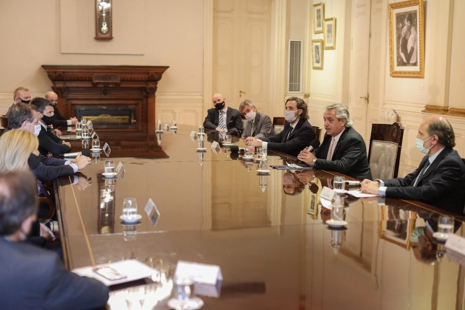 El presidente recibió a los bancos a las 18 en el Salón Eva Perón de la Casa Rosada. Participaron representantes del Banco Central, Banco Nación, Banco Santander, Banco Galicia, Banco Macro, bancos del Grupo Petersen y Credicoop, en nombre de las grandes entidades de la Argentina que participan de esta iniciativa.