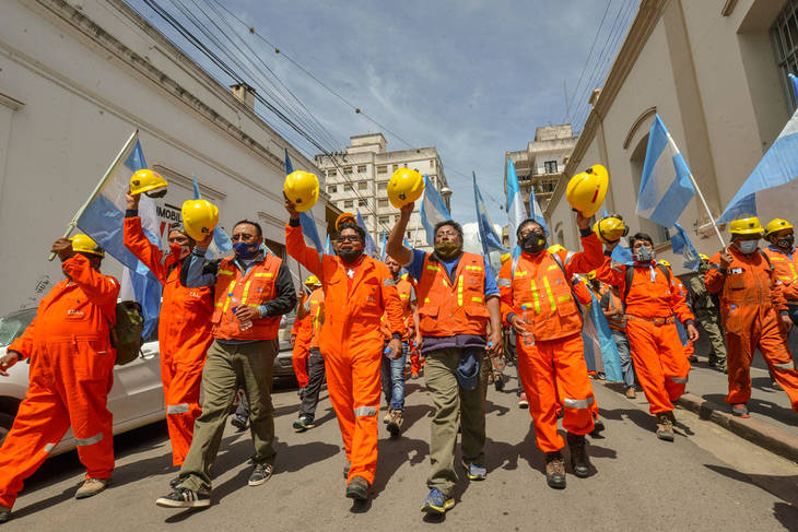 Desde que comenzaron las negociaciones, los mineros realizaron varias marchas hasta la capital provincial. El martes 12, mientras se desarrollaba la última reunión, estuvieron en la plaza Belgrano, frente a la Casa de Gobierno, expectantes, con sus overoles naranja.