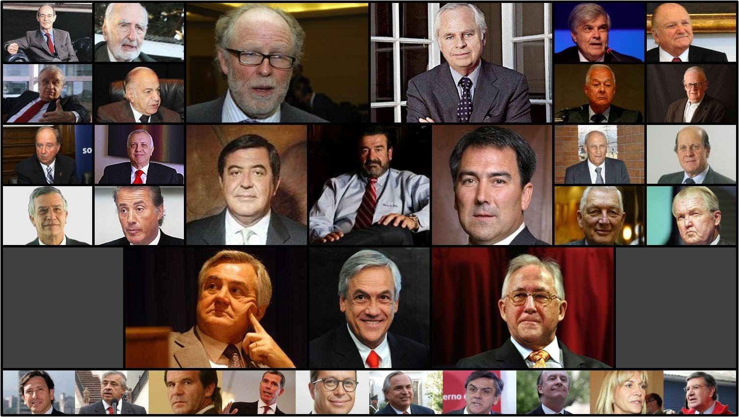 • Sebastián Piñera Echenique, de 67 años, ex presidente y ahora candidato presidencial de la derecha dura, poseedor de 2.700 millones de dólares acumulados como inversionista, incrementó su fortuna aún durante su presidencia (2010-2014). En febrero de 2009 Forbes le asignó 1.000 millones de dólares. Tras la campaña electoral y las elecciones de diciembre 2009 y la segunda vuelta de enero 2010, en febrero 2010 la revista le atribuyó 2.200 millones de dólares. Semanas antes de abandonar la presidencia en marzo de 2014, el ranking que se difunde en febrero lo presentó con 2400 millones de dólares.
